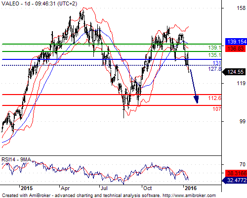 Le titre enfonce le support des 127.8, confirmant la tendance baissière en cours. Les moyennes mobiles à 20 et 50 séances se sont croisées à la baisse tandis que le RSI est négativement orienté san être en territoire de surachat.