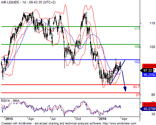 Le titre enfonce une oblique haussière en place depuis la mi-février. De son côté, le RSI se retourne à la baisse sous sa ligne de signal. Une poursuite du repli est ainsi attendue à court terme avec 90.7 euros comme premier objectif.