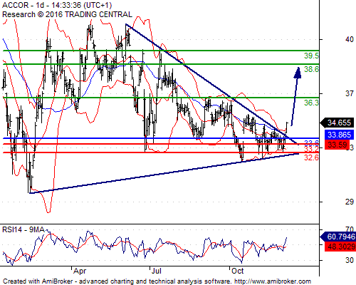 Le titre sort à la hausse d'une figure en triangle et casse ainsi une ligne de tendance baissière en place depuis juin dernier. La moyenne mobile à 20 périodes se retourne à la hausse. Une poursuite du rebond en direction des 36.15 euros et des 36.80 euros est attendue.