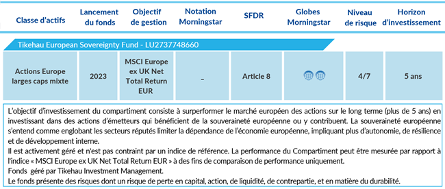 Notation Morningstar : Cette note est une mesure quantitative qui classe tous les mois les fonds sur la base de leur performance passée sur 3 ans sur une base ajustée du risque et par rapport à la moyenne de catégorie Morningstar à laquelle les fonds appartiennent. La notation va de 1 à 5. L'absence de notation d'un fonds s'explique généralement par le fait qu'il ne détient pas un historique de performance d'au moins trois ans. A défaut, dans quelques cas exceptionnels, l'absence de notation s'explique par le fait que la catégorie à laquelle appartient le fonds n'est pas évaluable.Article 8 = les produits qui promeuvent des caractéristiques environnementales et/ou sociales.
