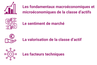 Nous avons développé un cadre exhaustif d’analyse de toutes les classes d’actifs au sein de nos comités d’investissement. Cette analyse mensuelle est basée sur 4 piliers :